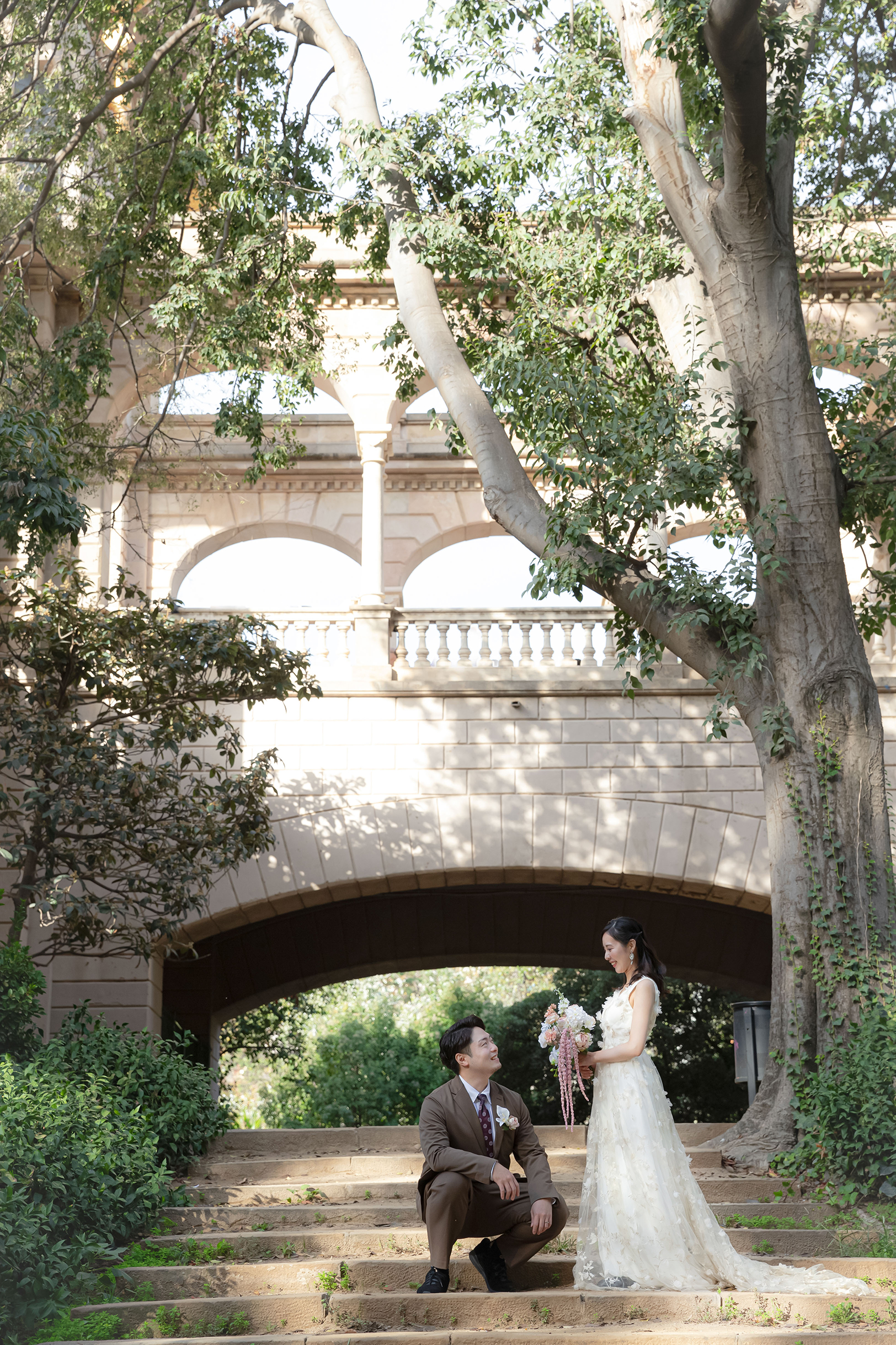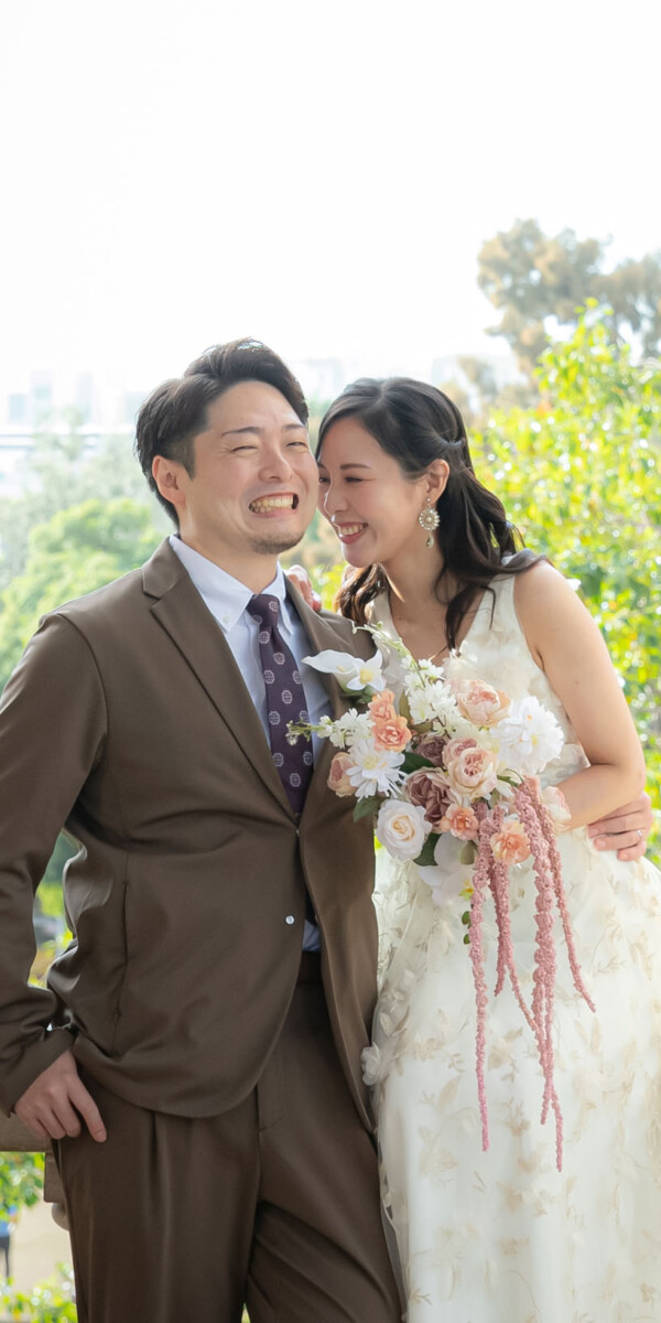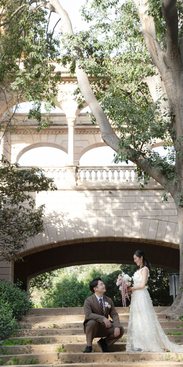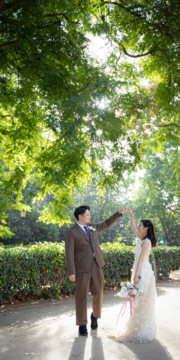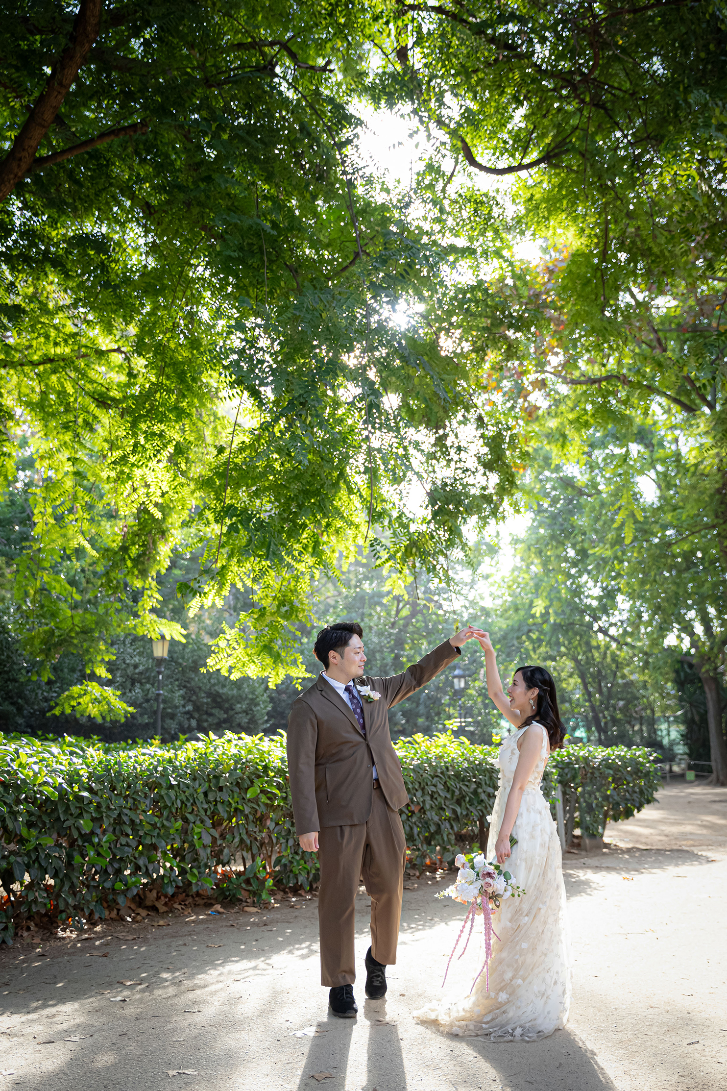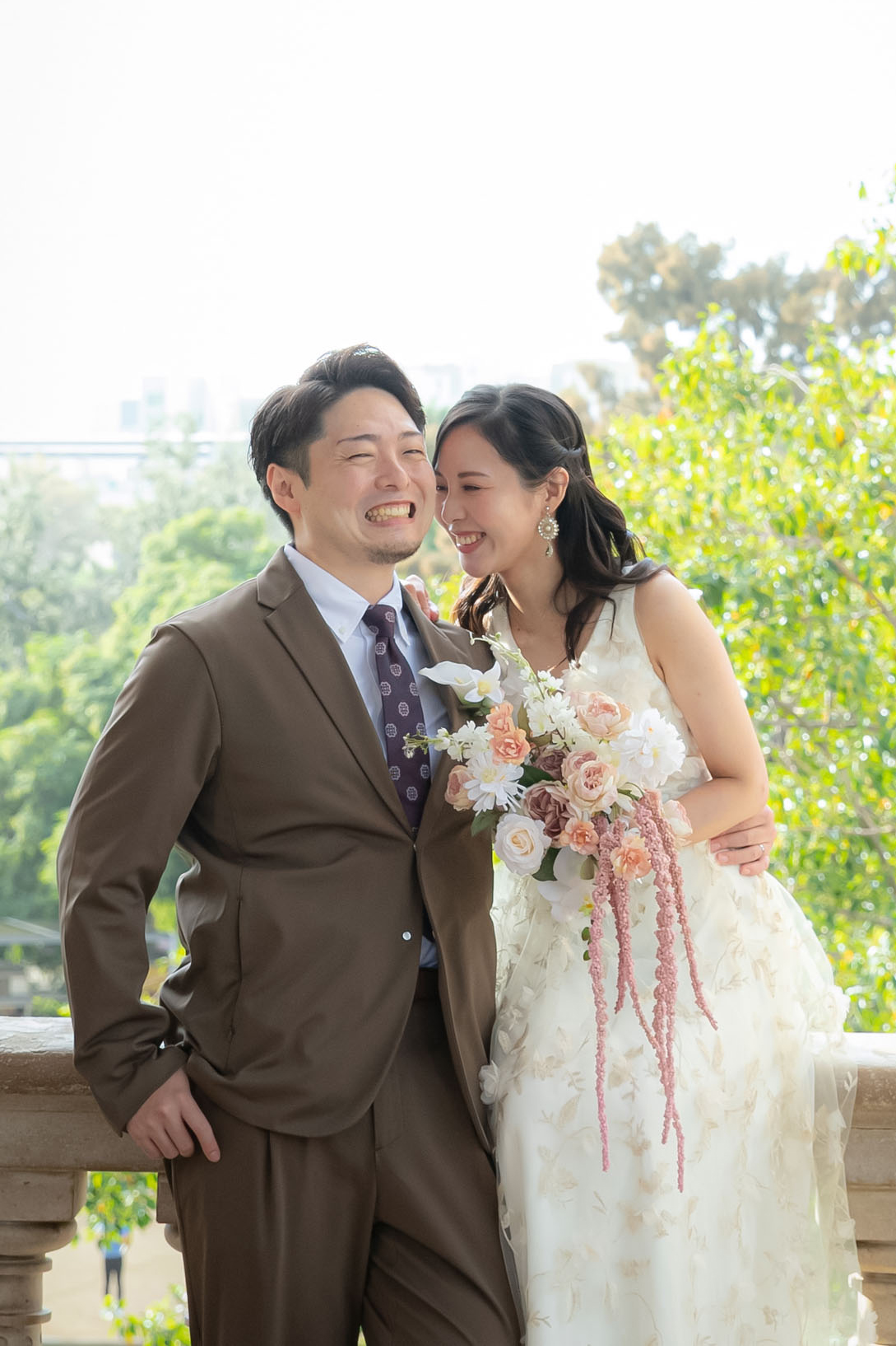 Light color coordination 和風なカラーテイストを織り交ぜながらスモーキーな色味を足して、ふんわりしたまとまりのあるコーディネートに。シウタデリャ公園の穏やかな緑とも相性ばっちりに計算した大人の印象漂う仕上がり。 CATEGORIESスモーキー系ブーケ, ピンク系ブーケ, 公園, 秋SEASON10月上旬BOUQUETバラ/藤/カラーHAIR MAKEUPハーフアップCOLOR COORDINATION