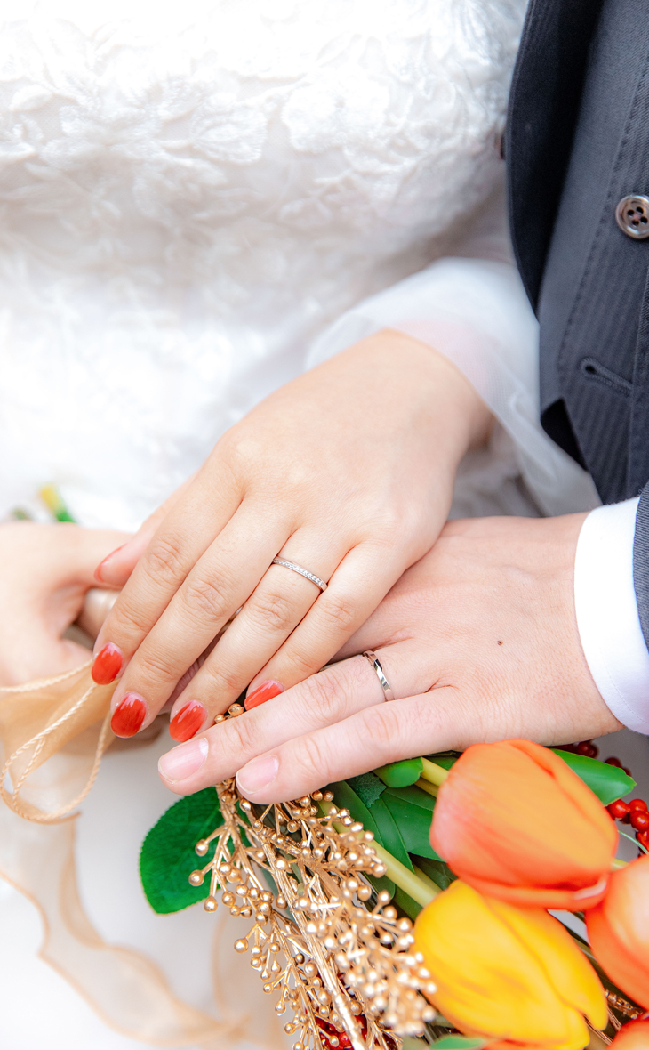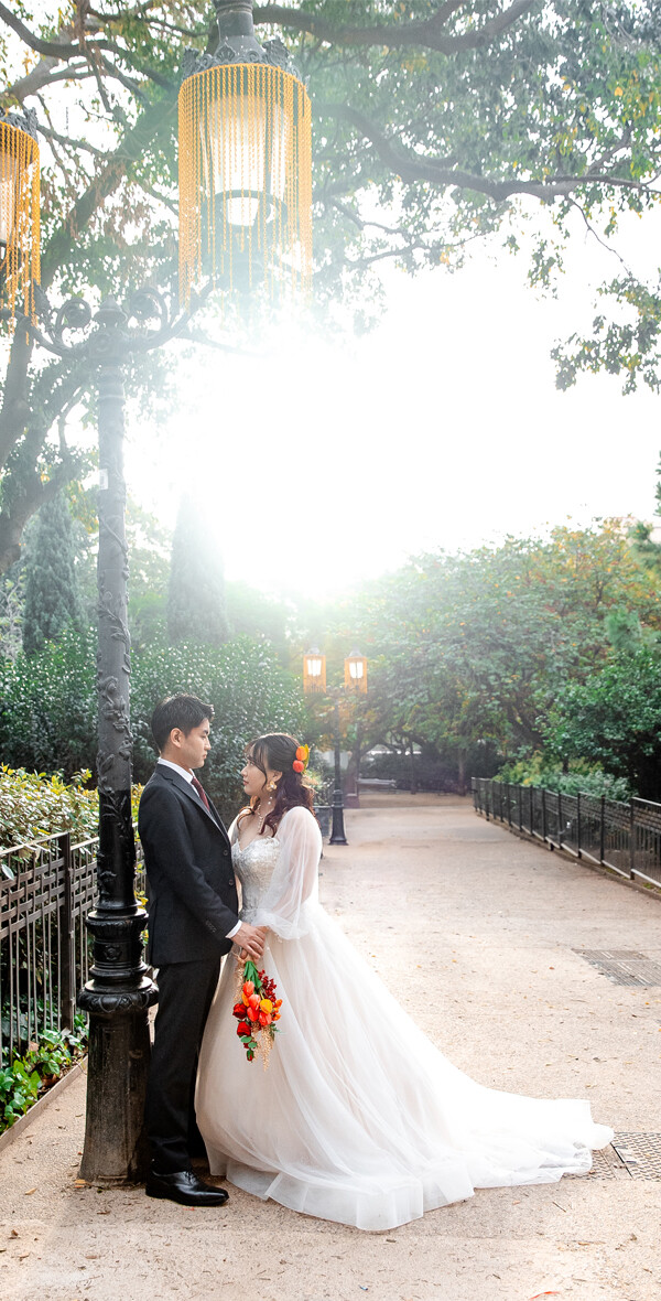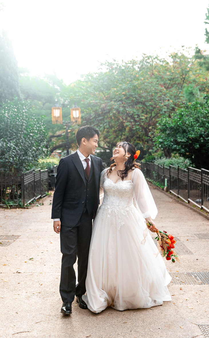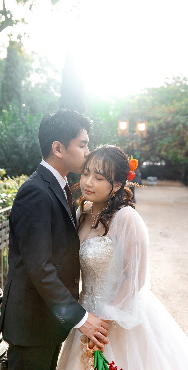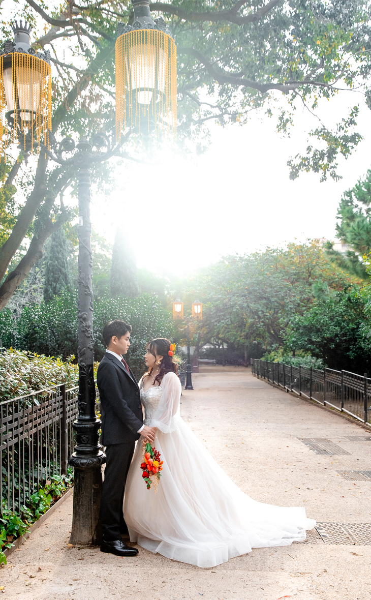 冬の静けさでしっとりとした朝。サグラファミリアの公園の緑がより一層落ち着いた色どりを魅せるときです。オフホワイトのシフォンドレスにエッジの利いたグレイッシュトーンのカラーコーデがピリッとしたアクセントになっています♪